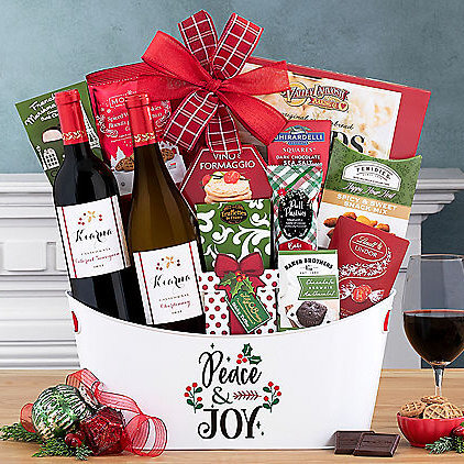 Send festive fun and cheer with this collection of sweet and savory snacks. This delicious assortment of holiday treats includes chocolate-dipped graham crackers, caramel popcorn, cheese straws, and much more, all inside a holiday gift basket.
